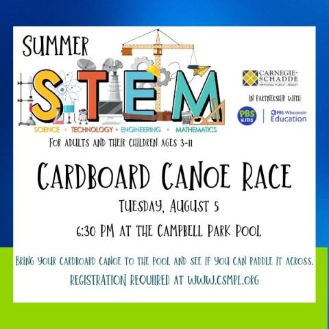 Bring your completed cardboard canoe to the Campbell Park pool to see if you can float your way across the pool. This program is intended for children ages 3-11 and their adults.