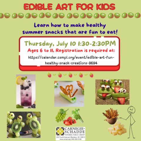 Edible Art for Kids, ages 6 to 11. Please note, we will be using knives that are meant for kids, but if you think your child will need assistance please feel free to attend.